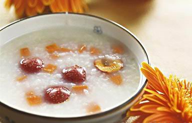 红枣含生物碱、氨基酸(氨基酸食品)、糖类、钙、磷及维生素C等。100克红枣中含维生素C380~900毫克,比苹果(苹果食品)和桃高100倍,有保护肝脏、增强肌力、抗过敏等作用。将100克粳米、50克红枣同煮成粥,煮熟后,加入适量的白糖,即可食用。红枣味甘助湿,不可食用过多,2~4岁的婴幼儿每次食4~6枚为宜,过多食用会出现脘腹胀闷、食欲不振现象。